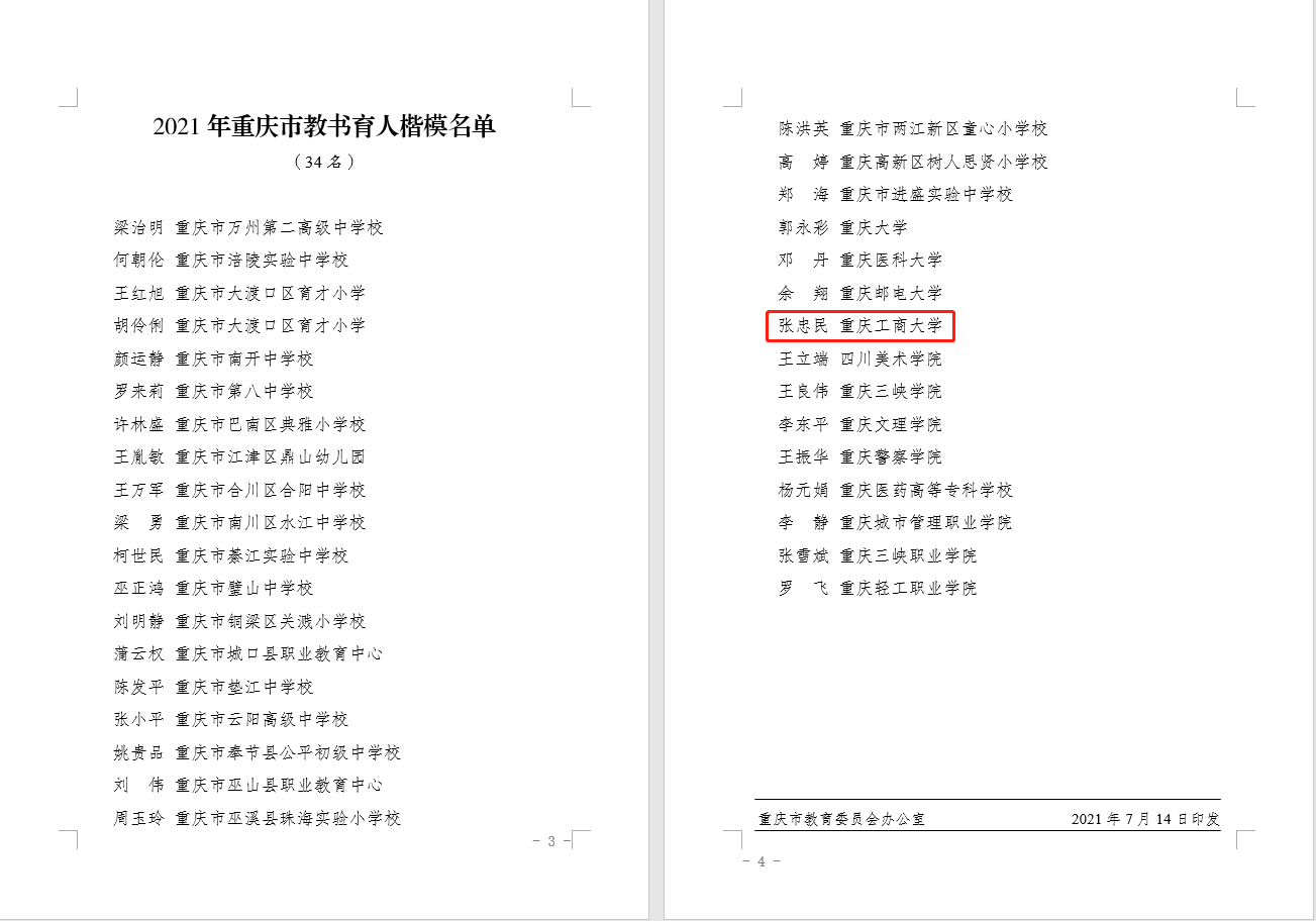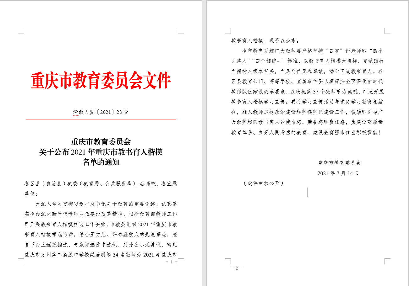 为深入学习贯彻习近平总书记关于教育的重要论述,认真落实全面深化新时代教师队伍建设改革精神,市教委组织开展了2021年重庆市教书育人楷模推选活动,KY开元法学与社会学学院教师张忠民获评2021年重庆市教书育人楷模,全市共34名教师获得此项荣誉称号。