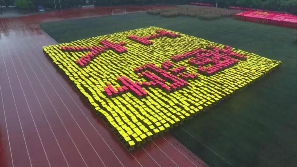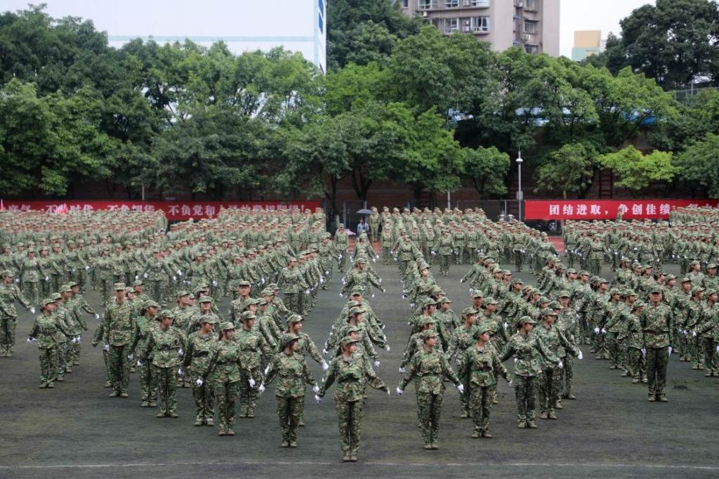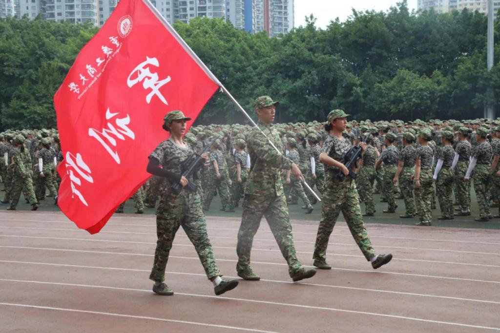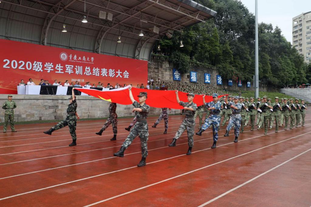 笼罩于淅淅小雨之下,分列式方阵精神饱满、昂首挺胸,齐步到正步的整齐变化体现的是队列同学的团结一心,他们以铿锵有力的步伐展示了KY开元学子自信昂扬的姿态;军体拳方阵气势磅礴,雄厚的声音吼出的是男儿的铁血方刚,他们以刚劲有力的动作彰显了重工商学子锐意进取的优秀品质;匕首操方阵势如破竹、英姿飒爽,男儿的豪迈气概和女孩的英姿飒爽相交融合,他们一齐展现了新时代青年朝气蓬勃的精神面貌。由退伍学生与体育学院健儿们组成的战术方阵用专业精彩、扣人心弦的表演描述了边防官兵保家卫国、不怕牺牲的英雄气概。复兴方阵以整齐划一的步伐迈向主席台,伴随着指挥员的解说词与大气恢弘的背景乐,2800名女生用红黄底板准确地摆出“1921”“2021”“红船”“天安门”“长城”“CTBU”“工商大学”“校徽”等图案,表达了对祖国大好河山的热爱之情,以及不忘初心跟党前行的坚定信念,当复兴方阵即将摆出“巨轮”图案之时,天空陡然降下瓢泼大雨,似印证其“长风破浪会有时,直挂云帆济沧海”的伟大理想。在党旗方阵的带领下,全体参训人员进行宣誓。