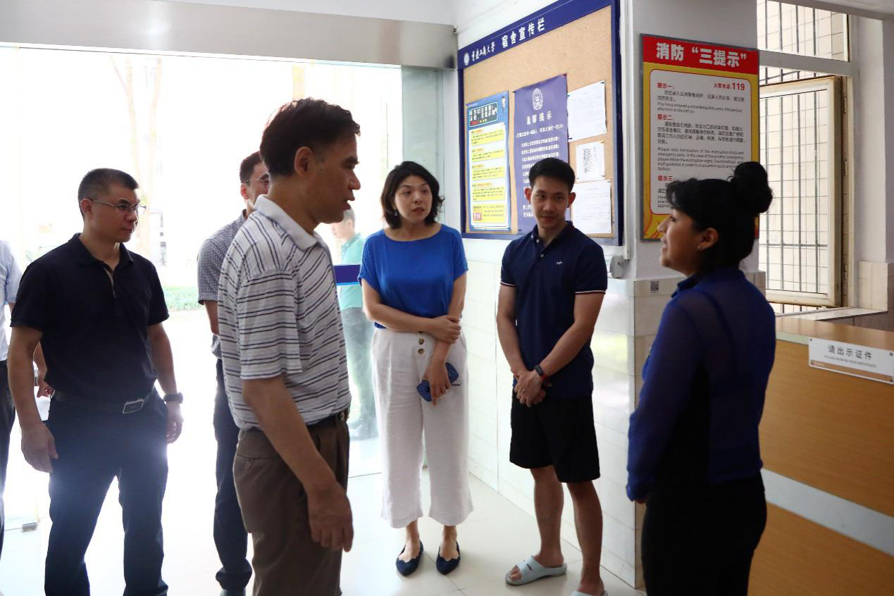 在厚德楼相关部门办公室、值班室,李志雄详细询问了工作人员值班情况,对大家持续坚守岗位表示肯定和感谢。在保卫处,李志雄一行听取了暑期安稳工作情况汇报,并代表学校向在高温烈日下仍然做好校园巡逻、排查、值守工作的一线工作人员表示关心慰问,嘱咐大家注意防暑,保证良好身体和精神状态,确保暑期校园安全稳定。在兰园食堂,李志雄认真了解食堂暑期各项工作运转情况、师生就餐情况等,对大家辛勤工作给予肯定并强调,暑期要继续把好食品安全关,为留校师生提供良好的就餐等后勤服务。在兰花湖片区,李志雄一行就师生留校情况、疫情防控等工作与留校工作人员细致交流,希望大家站好暑期这一班岗,确保假期校园平稳运行。随后,李志雄一行来到南岸校区留学生公寓、南区学生公寓,与留校学生亲切交谈,了解同学们暑期学习安排、生活情况与需要学校解决的困难,嘱咐同学们暑期认真学习习近平总书记“七·一”讲话,持续开展党史学习,紧抓专业课程学习。当得知杨雨晴同学来自河南时,李志雄十分关心其家乡受灾及救援情况,详细询问家中现状并表示,学校高度关注此次河南暴雨受灾区域的同学,将多措并举帮助受灾同学渡过难关。