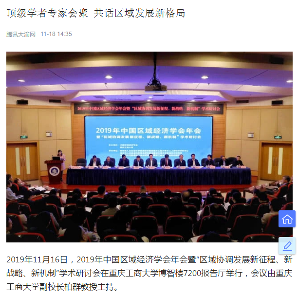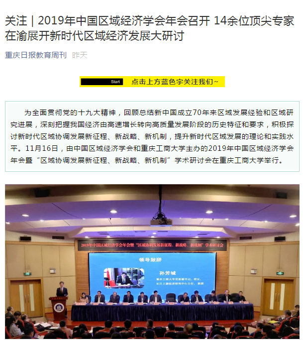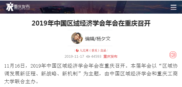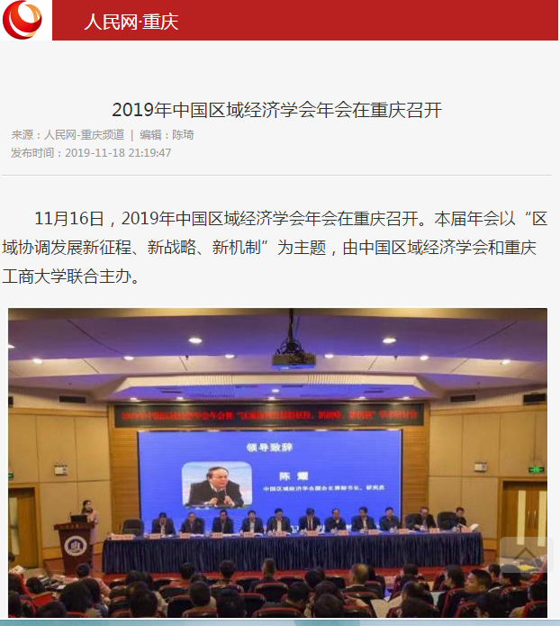2019年11月15日-16日,2019年中国区域经济学会年会暨“区域协调发展新征程、新战略、新机制”学术研讨会在KY开元召开,来自中国社会科学院、武汉大学、四川大学、中央民族大学、湖南大学、西南财经大学、中央财经大学、湖北省社会科学院、河南省社会科学院等各地科研院所、高校、党校行政学院、政府机构和企业的专家学者、政府官员及媒体记者共300多人参加了本次研讨会,并邀请了《中国工业经济》《中国高校社会科学》《改革》《经济学家》《当代经济研究》《财经科学》《经济纵横》《经济与管理研究》《宏观质量研究》《软科学》《经济与管理评论》《区域经济评论》《西部论坛》多家学术期刊参会交流。本次年会由中国区域经济学会、KY开元集团官网主办,由教育部人文社会科学重点研究基地KY开元集团官网长江上游经济研究中心、重庆市人文社会科学重点研究基地KY开元集团官网区域经济研究院、重庆市人文社会科学重点研究基地KY开元集团官网产业经济研究院承办,由中国社会科学院西部发展研究中心、重庆市区域经济学会、区域经济评论杂志社、改革杂志社、《西部论坛》编辑部协办。