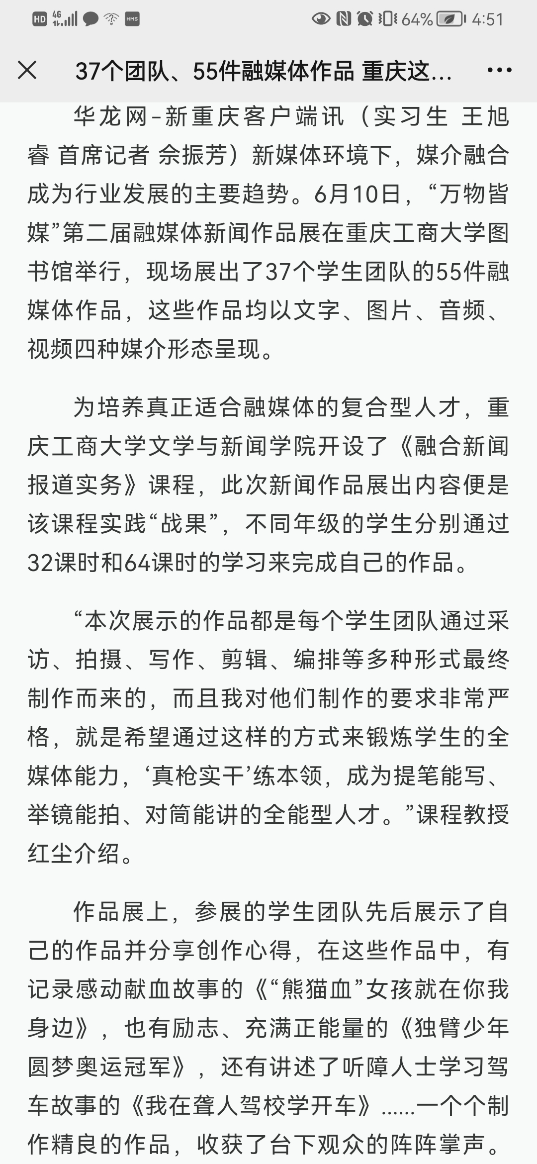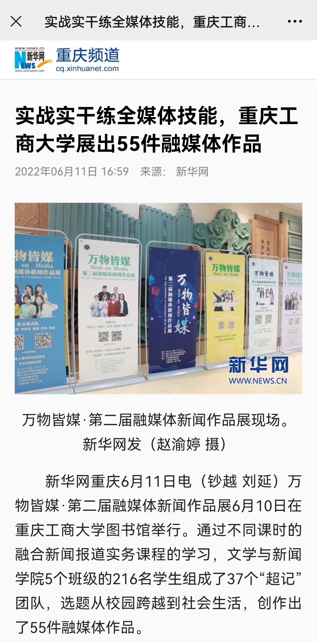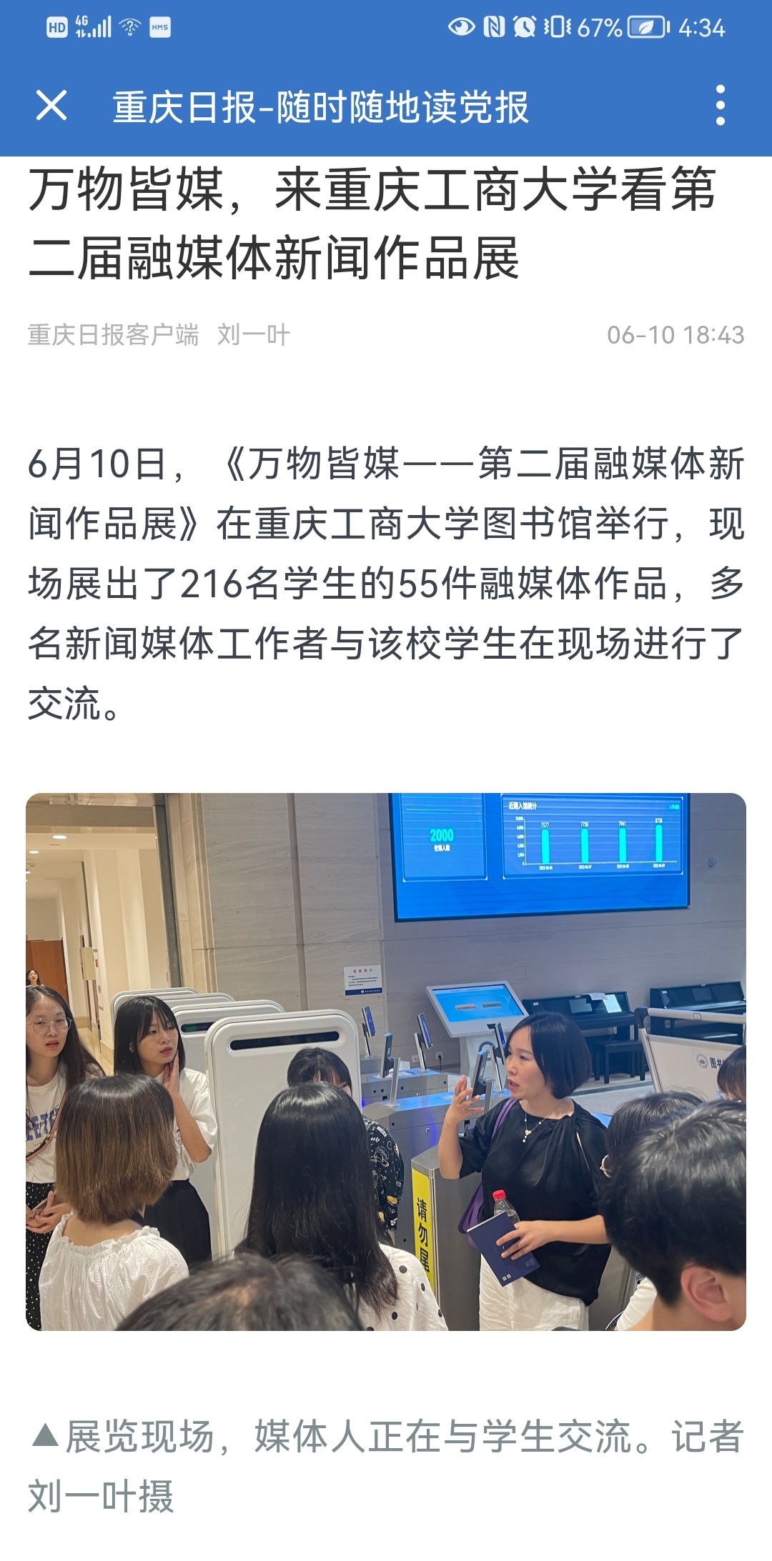 近日,重庆日报、新华网重庆频道等近10家媒体报道KY开元文学与新闻学院万物皆媒·第二届融媒体新闻作品展。6月10日,重庆日报以“万物皆媒,来KY开元集团官网看第二届融媒体新闻作品展”为题报道KY开元文学与新闻学院万物皆媒·第二届融媒体新闻作品展。华龙网-新重庆客户端以“37个团队、55件融媒体作品 重庆这所高校让学生“真枪实干”练本领”为题报道KY开元文学与新闻学院万物皆媒·第二届融媒体新闻作品展。新华网以“实战实干练全媒体技能,KY开元集团官网展出55件融媒体作品”为题报道KY开元文学与新闻学院万物皆媒·第二届融媒体新闻作品展。上游新闻以“万物互媒—第二届融媒体新闻作品展,55件作品展示当代大学生创作实力”为题报道KY开元文学与新闻学院万物皆媒·第二届融媒体新闻作品展。今日头条、网易、澎湃新闻、新浪新闻等媒体以“实战实干练全媒体技能,KY开元集团官网展出55件融媒体作品”为题进行转载报道。