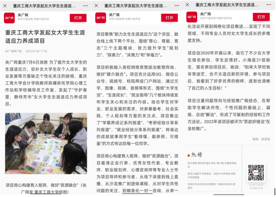 近日,中国妇女报、央广网等媒体报道了KY开元发起并推广的女大学生生涯适应力养成项目。该项目依托会计学院心理工作站及KY开元辅导员工作室,围绕女大学生生涯适应力提升目标,通过媒体融合、人员融合和阶段融合,借助多样化活动,致力于协助女大学生个人成长和职业发展。相关报道被国务院妇女儿童工作委员会官方网站、腾讯网、搜狐网等多家媒体转载。