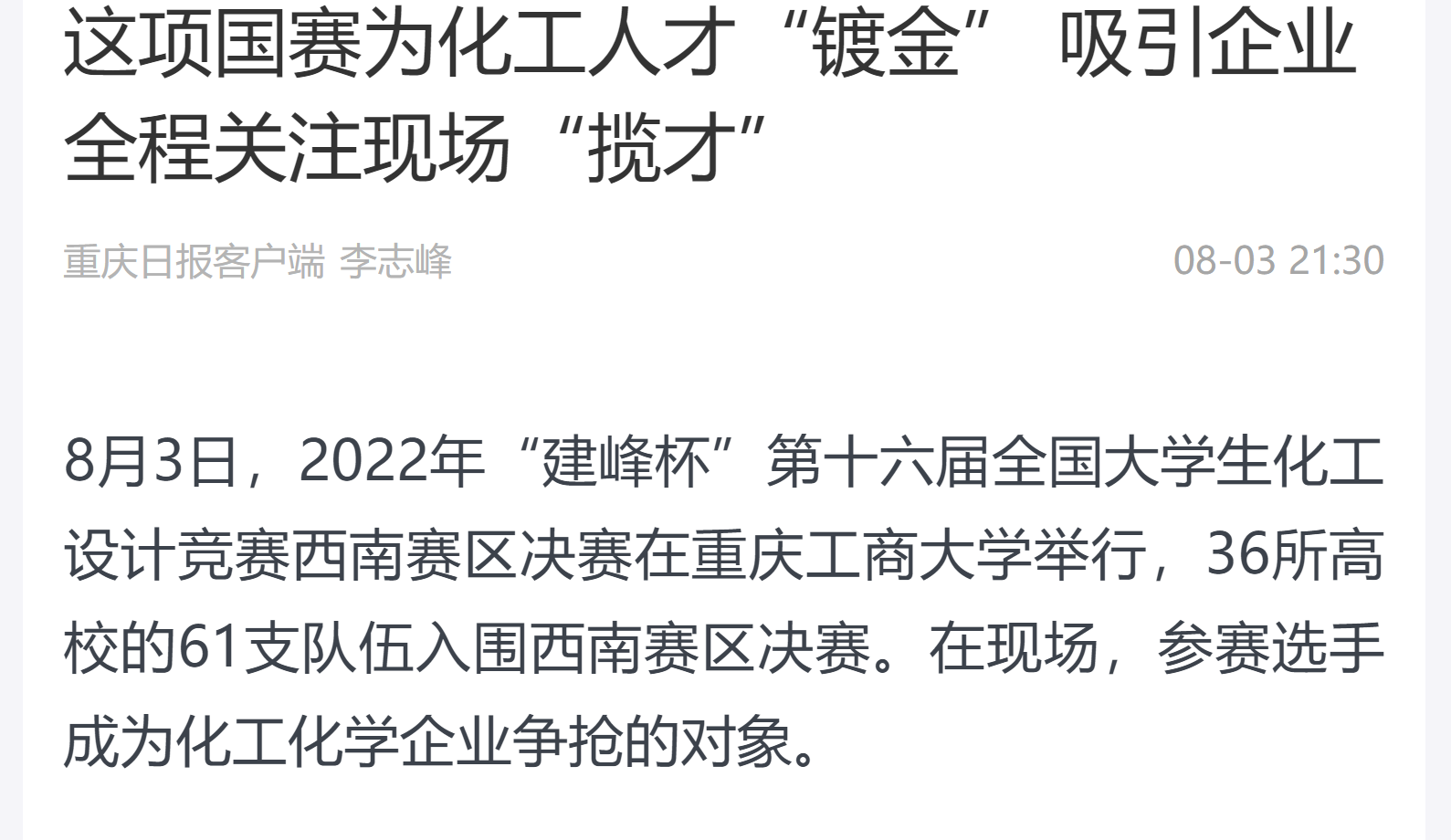 重庆日报报道KY开元承办2022年“建峰杯”第十六届全国大学生化工设计竞赛西南赛区决赛