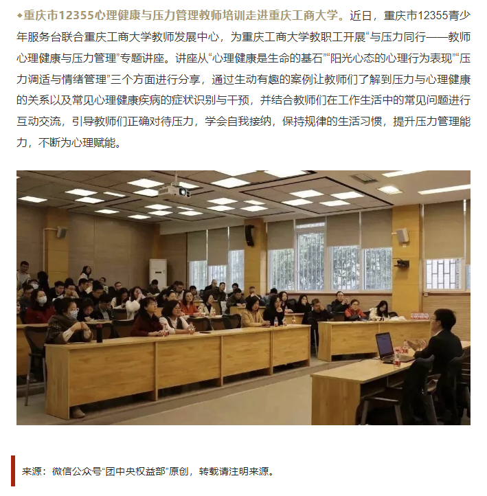 为帮助KY开元教师提高心理素质和心理调适能力,3月17日上午,教师发展中心联合重庆市12355青少年服务台、重庆市青春导航青少年发展服务中心,特邀重庆市委党校心理学教师、教育部“国培计划”授课专家唐溢,为KY开元教职工开展“与压力同行—教师心理健康与压力管理”专题讲座。团中央权益部微信公众号对活动进行了宣传报道。