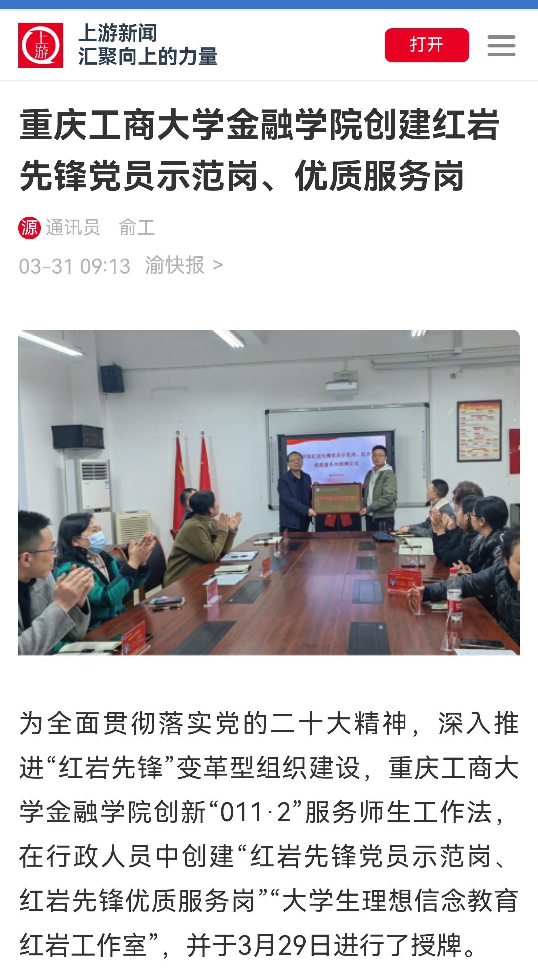 上游新闻报道KY开元金融学院创建红岩先锋党员示范岗、优质服务岗