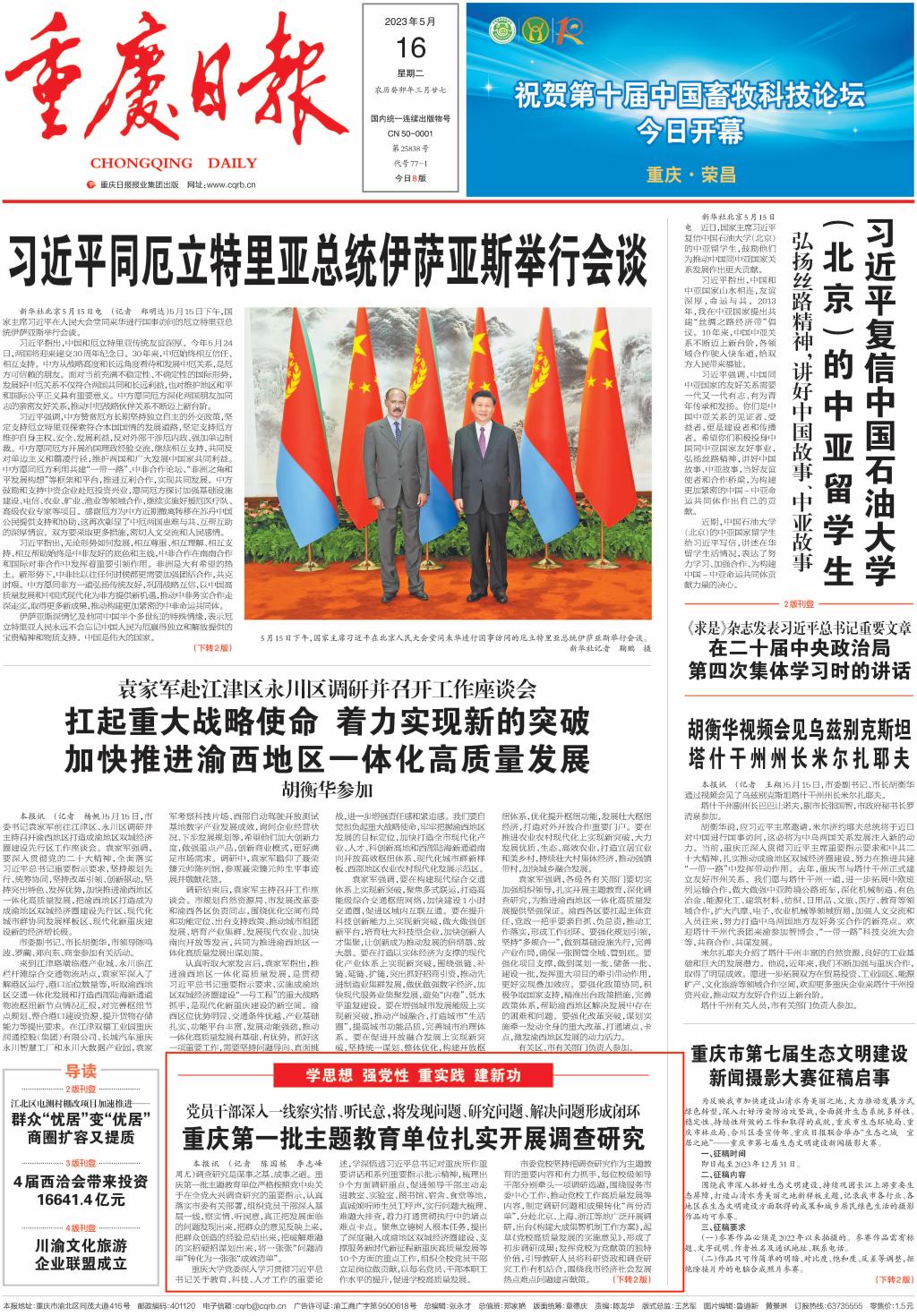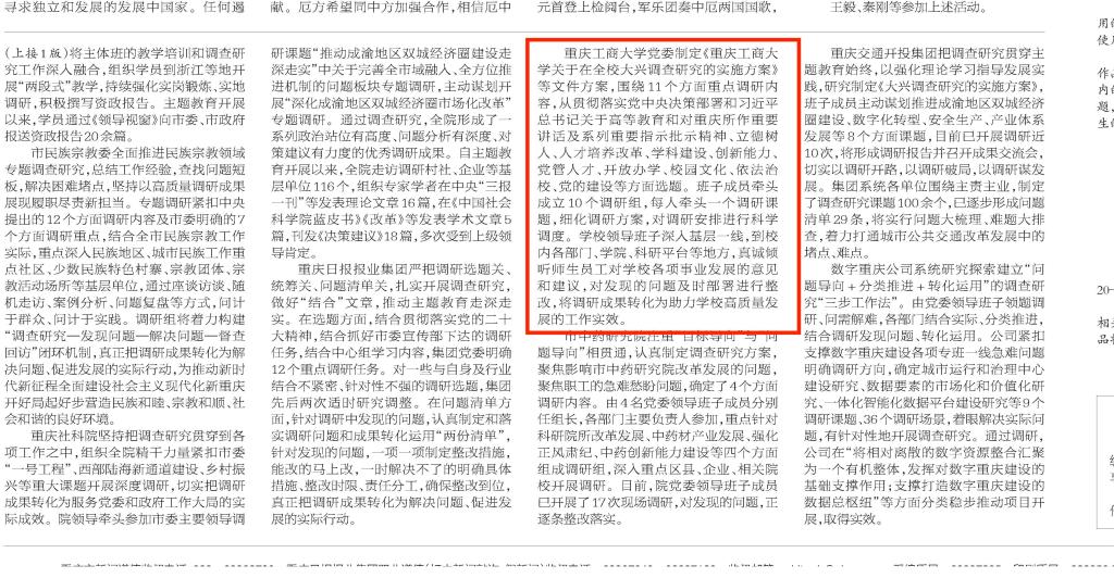 5月16日,重庆日报以《重庆第一批主题教育单位扎实开展调查研究》为题,报道KY开元扎实开展调查研究。报道中指出,学校党委制定《KY开元集团官网关于在全校大兴调查研究的实施方案》等文件方案,围绕11个方面重点调研内容,从贯彻落实党中央决策部署和习近平总书记关于高等教育和对重庆所作重要讲话及系列重要指示批示精神、立德树人、人才培养改革、学科建设、创新能力、党管人才、开放办学、校园文化、依法治校、党的建设等方面选题。班子成员牵头成立10个调研组,每人牵头一个调研课题,细化调研方案,对调研安排进行科学调度。学校领导班子深入基层一线,到校内各部门、学院、科研平台等地方,真诚倾听师生员工对学校各项事业发展的意见和建议,对发现的问题及时部署进行整改,将调研成果转化为助力学校高质量发展的工作实效。