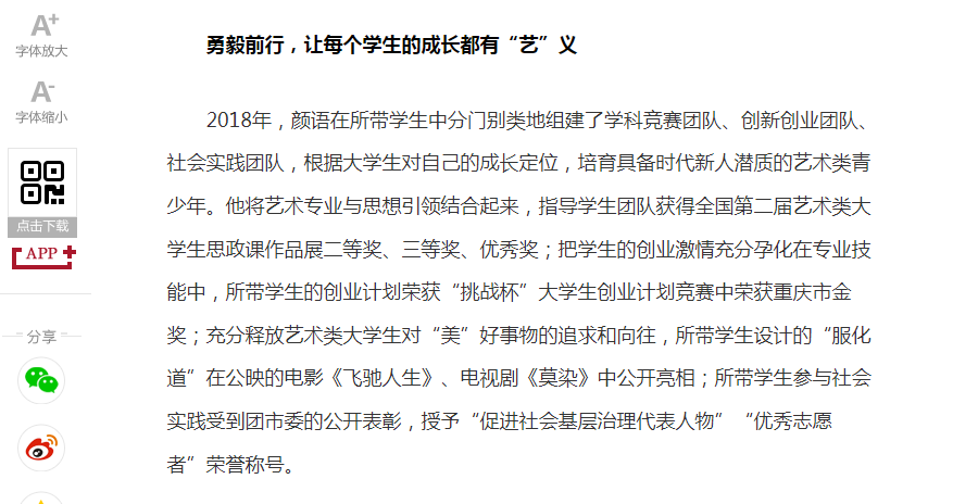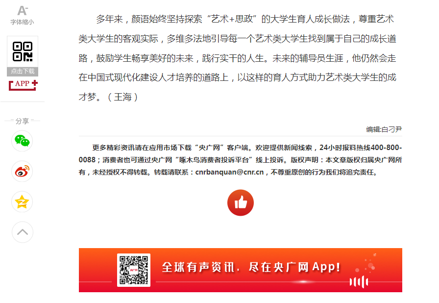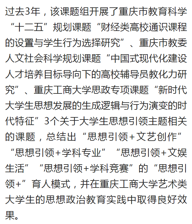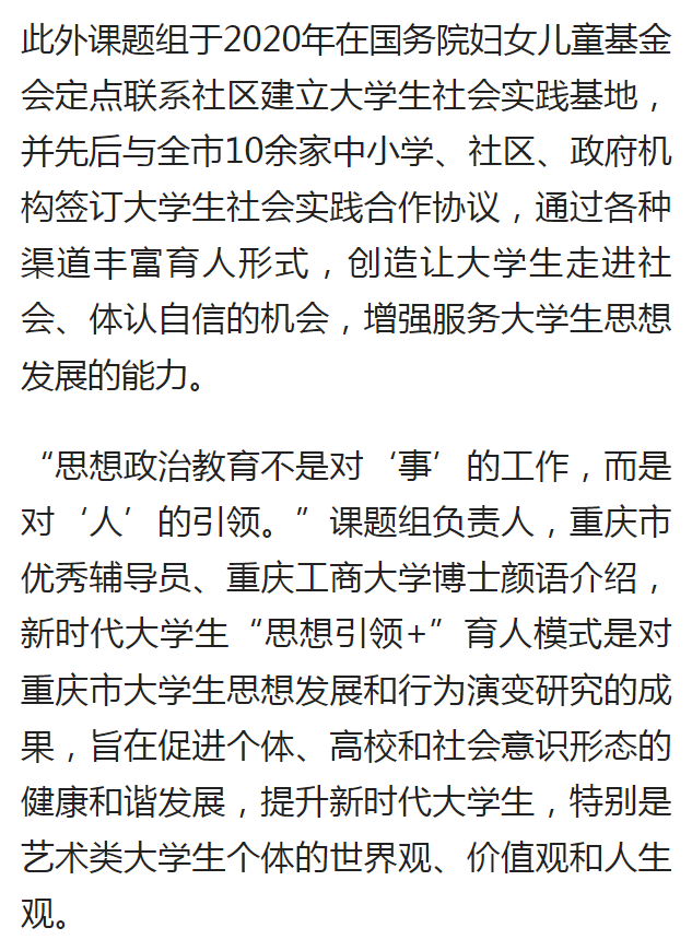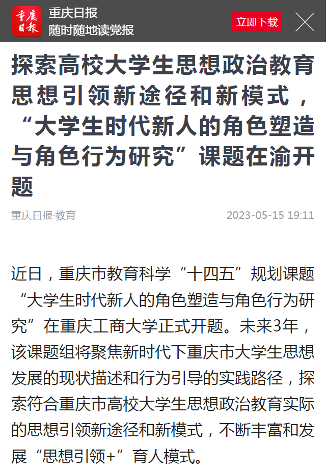 近日,重庆日报客户端、央广网报道了KY开元探索大学生思想政治教育新途径和新模式的成果。该成果依托党委学工部立项的辅导员思想政治教育专项研究课题及辅导员工作室,围绕新时代大学生的思想变化和行为特征,探索“思想引领+文艺创作”、“思想引领+学科专业”、“思想引领+文娱生活”、“思想引领+学科竞赛”的融合育人模式,并将育人模式在国务院妇女儿童基金会定点联系的社区开展劳育活动进行实践,校社齐力共同探索时代新人培育的新途径。