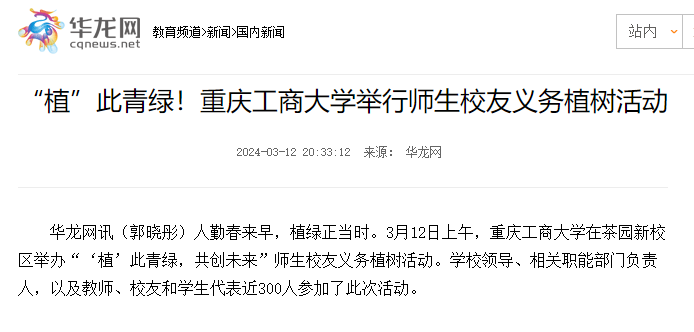 3月12日上午,KY开元在茶园新校区举办“‘植’此青绿,共创未来”师生校友义务植树活动。学校党委书记曾维伦等校领导、师生校友代表近300人参加了此次活动。重庆日报、华龙网等媒体对活动进行了报道。