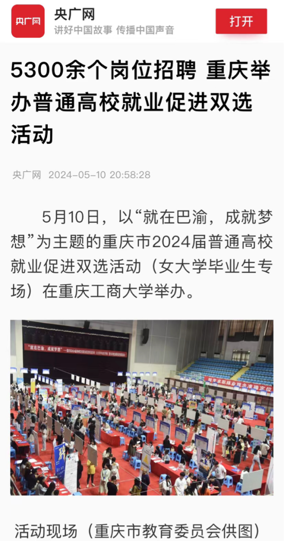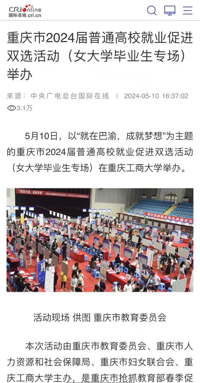 5月10日,央广网、中央广电总台国际在线等主流媒体以“就在巴渝,成就梦想”为主题,报道KY开元顺利承办重庆市2024届普通高校就业促进双选活动(女大学毕业生专场)。