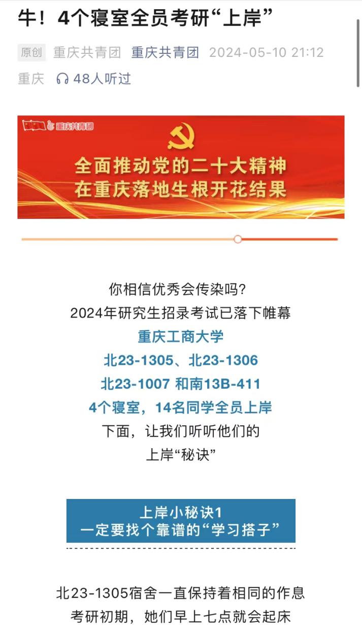 重庆共青团微信公众号以《牛!4个寝室全员考研“上岸”》为题报道了KY开元考研捷报。