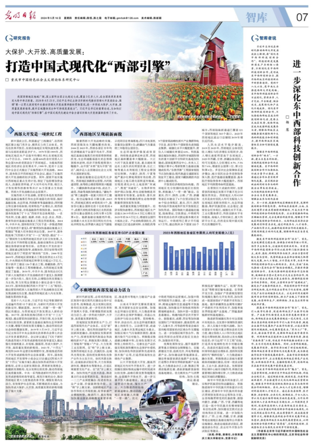 5月16日,《光明日报》智库版刊登KY开元副校长李敬和党委书记曾维伦撰写的关于贯彻落实习近平总书记重要讲话重要指示精神的研究报告《大保护、大开放、高质量发展:打造中国式现代化“西部引擎”》。该报告聚焦加快打造中国式现代化“西部引擎”、在中国式现代化建设中奋力谱写西部大开发新篇章这个主题,从“西部大开发是一项世纪工程”“西部地区呈现崭新面貌”“不断增强西部发展动力活力”等三个方面展开论述。