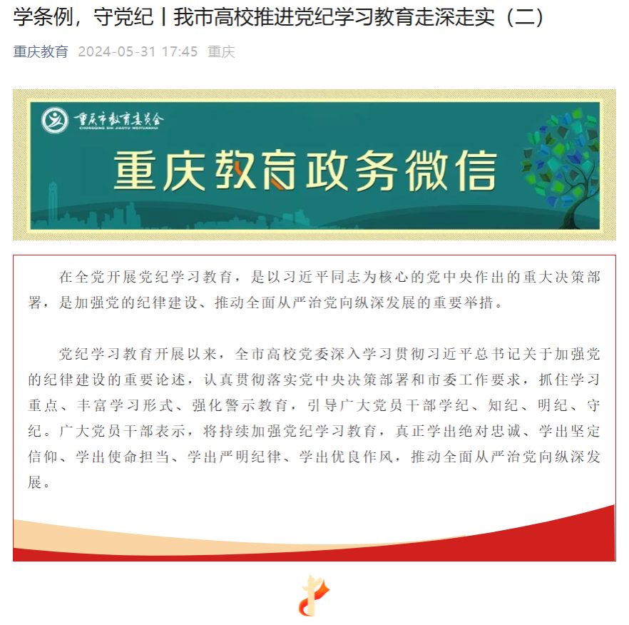 5月31日,市教委微信公众号报道KY开元开展党纪学习教育的相关情况。