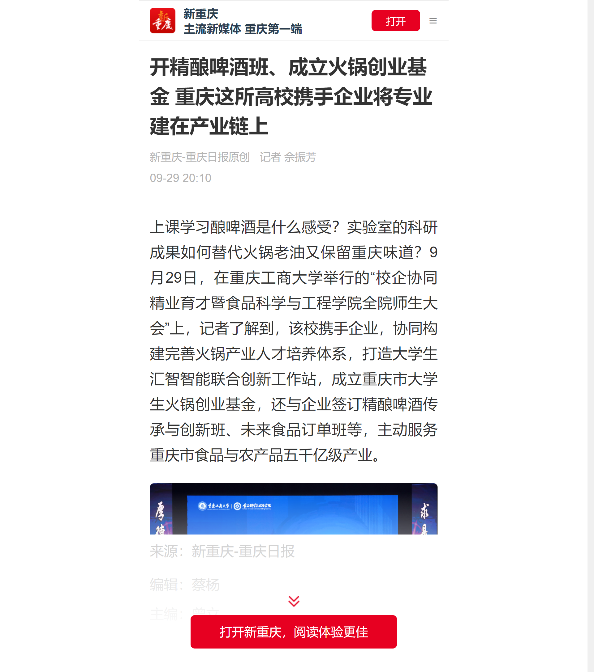 《重庆日报》新重庆客户端报道了校企协同精业育才暨食品科学与工程学院全院师生大会情况。