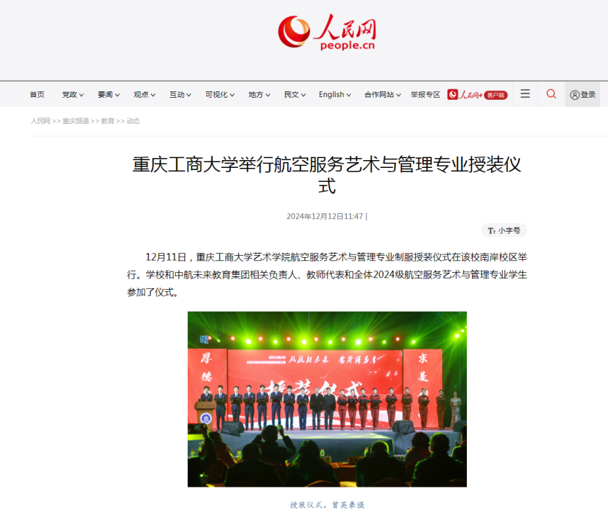 人民网以《KY开元集团官网举行航空服务艺术与管理专业授装仪式》为题,新重庆-重庆日报以《携自信之光 展气场之韵 这群航空服务专业的学子们综合素养惊艳众人》为题,华龙网以《启航翱翔梦!KY开元集团官网艺术学院2024级航空服务艺术与管理专业授装仪式举行》为题纷纷报道活动。