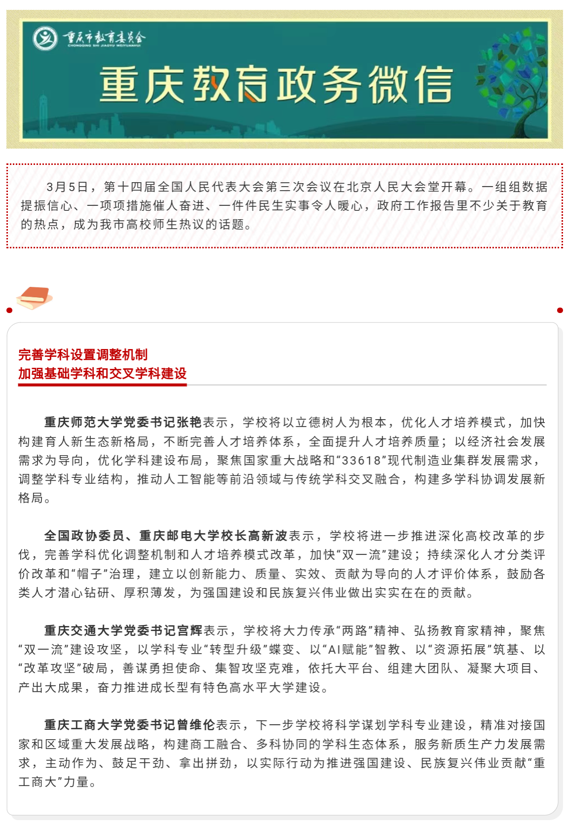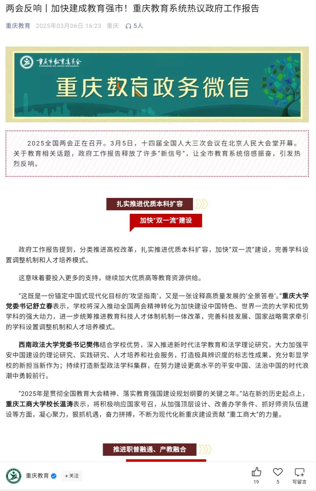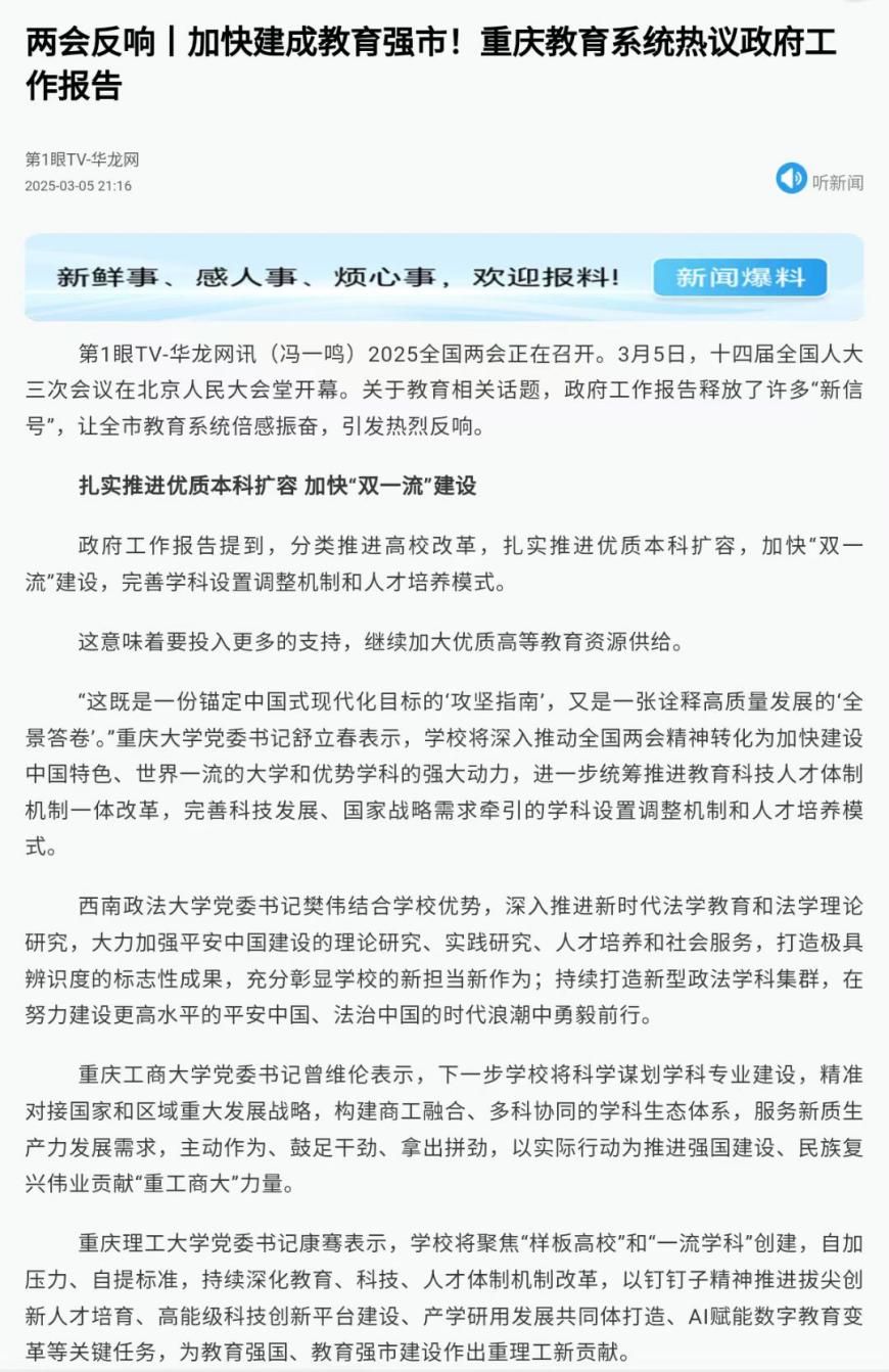 2025全国两会正在召开。3月5日,十四届全国人大三次会议在北京人民大会堂开幕。关于教育相关话题,政府工作报告释放了许多“新信号”,引发KY开元干部师生的高度关注和热烈反响。第一眼TV-华龙网和重庆教育公众号对此进行了报道。