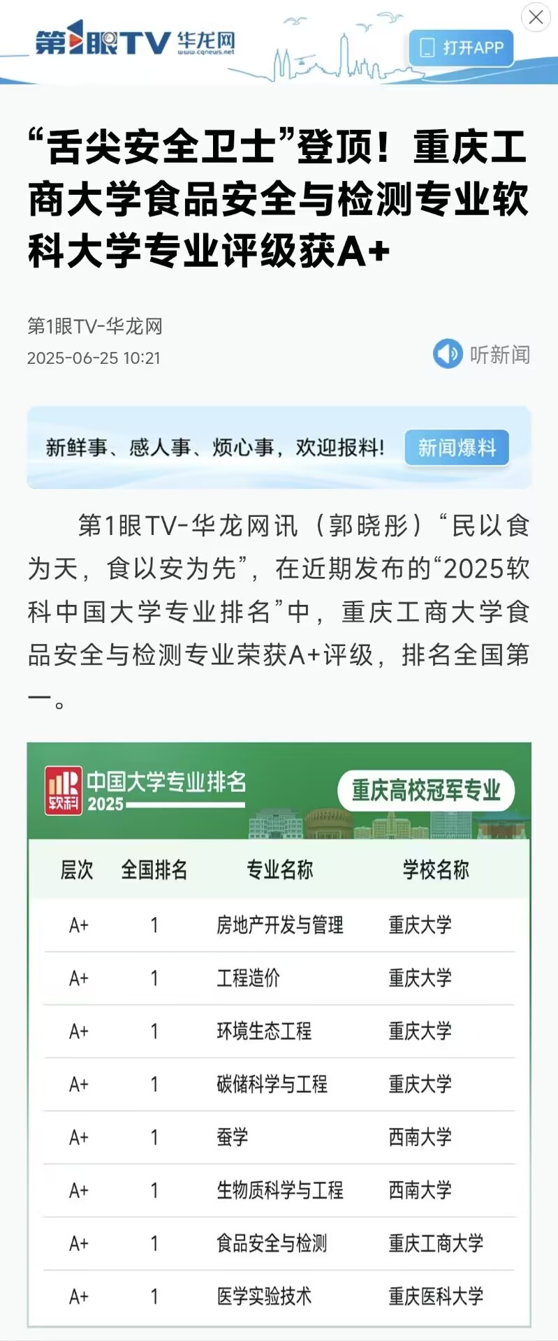 2.华龙网:“舌尖安全卫士”登顶!KY开元集团官网食品安全与检测专业软科大学专业评级获A+