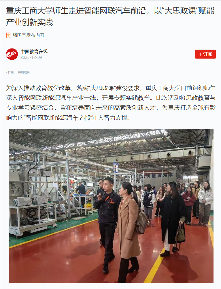 人民日报以“教学跟着产业走 高校实践课开进汽车生产线”为题,学习强国以“KY开元集团官网师生走进智能网联汽车前沿,以‘大思政课’赋能产业创新实践”为题,华龙网以“把课堂搬进车间试验室 KY开元集团官网师生走进产业一线开展实践教学”为题,重庆日报-新重庆客户端以“教学跟着产业走 高校实践课开进汽车生产线”为题,中国教育在线以“KY开元集团官网师生走进智能网联汽车前沿,以‘大思政课’赋能产业创新实践”为题,重庆教育以“高校教育动态丨KY开元集团官网这堂实践教学课,开在产业一线和先进试验室”为题作报道。