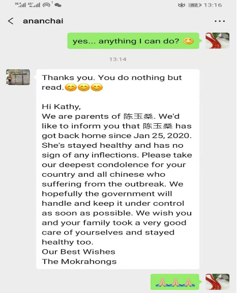 留学生院从1月21日起,全面摸排100余名在册留学生的动向,建立了精细化的台账,跟踪记录包括已回国的留学生健康状况。利用留学生院公众号平台发布或转发相关信息近30条,日常的关心联系不计其数。留学生院教师24小时全方位在线,安抚留学生情绪,解决留校留学生的实际困难,与出入境管理部门、校外住宿留学生所在社区等保持沟通,以高度的责任感和使命感,做实做细每一项工作,确保KY开元留学生群体疫情期间的健康和平安。一名泰国籍留学生家长的致信学院:“我们是陈玉桑的父母,陈玉桑在1月25日的时候已经平安到家,在你们的关心和帮助下,她的身体健康,没有感染迹象。在此向中国和中国人民遭受疫情影响表示慰问和祝福。我们由衷希望中国政府能够尽快成功控制疫情发展,也祝愿学校师生平安,身体健康!”