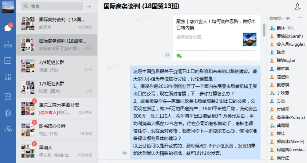 在第一阶段的讨论中,老师们一致认为应围绕知识-素质-能力进行课程建设,以提高教学质量为目的,思考在线教学和课堂教学方式的运用与衔接。学院教指委副主任刘成杰教授以西方经济学课程为例,主张用经济抽象、分析范式、数据素养以及综合素养等五方面进行理论教学,在课程范式和知识框架上下功夫。政治经济学课程组组长唐路元教授认为,在线教学的课程内容更要加强理论性、逻辑性和知识性,每句话都要讲透彻,引导学生理解深层次的理论知识,不然就会流于形式,照本宣科。另一方面,在线教学的好的工具与方法,如在线教学辅助平台、在线开方课程、企业微信教学班、混合教学方式等,应在未来课堂教学中贯彻并长期坚持使用。“贸易经济学”课程组长张驰博士提出以翻转课堂的模式,将课程内容作任务分解,让学生不断“通关”学习,利用“雨课堂”实现课堂中的在线讨论,提高学生的学习兴趣性。