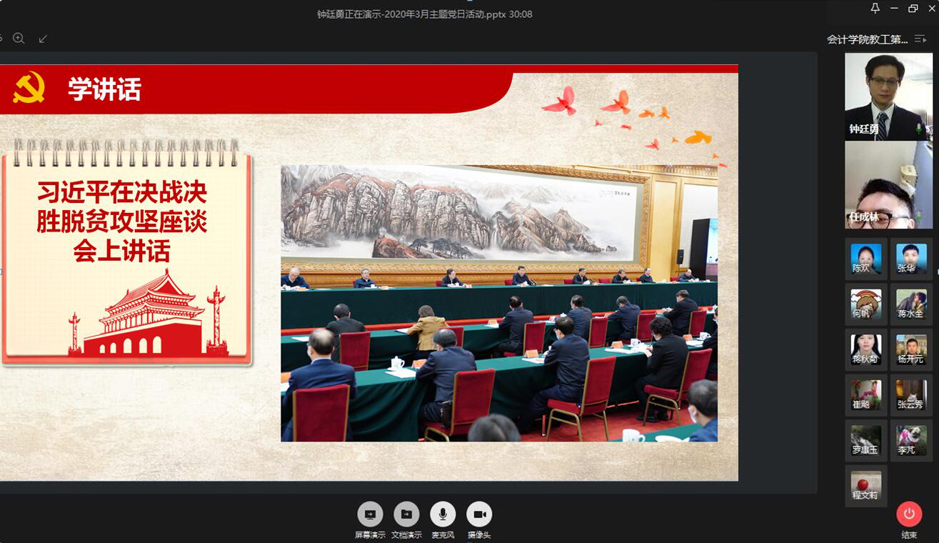 会计学院教工二支部支委顾飞同志、支部书记钟廷勇同志先后领学和解读了《习近平在统筹推进新冠肺炎疫情防控和经济社会发展工作部署会议上的讲话》《习近平在决战决胜脱贫攻坚座谈会上的讲话》两个重要文献,特别提出各位党员教师同志应重点关注习近平总书记在讲话中专门强调的“企业复工复产面临的债务偿还、资金周转和扩大融资等迫切问题”“防止企业资金链断裂”等党和国家重点关切的企业财务管理专业领域相关问题,将其有效地融入专业课堂和科学研究之中,激发学生为促进企业复工复产、推动我国经济社会高质量发展贡献专业智慧的勤学报国之心,为广大学生居家网络学习注入价值新动力和思想新动能。
