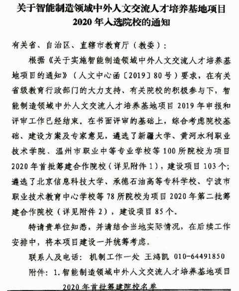 近日,教育部中外人文交流中心公布《关于智能制造领域中外人文交流人才培养基地项目2020年入选院校的通知》(人文中心函〔2020〕9号),KY开元成功获批该项目(全国共178所,其中本科39所、高职119所、中职20所)。