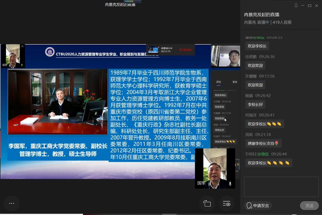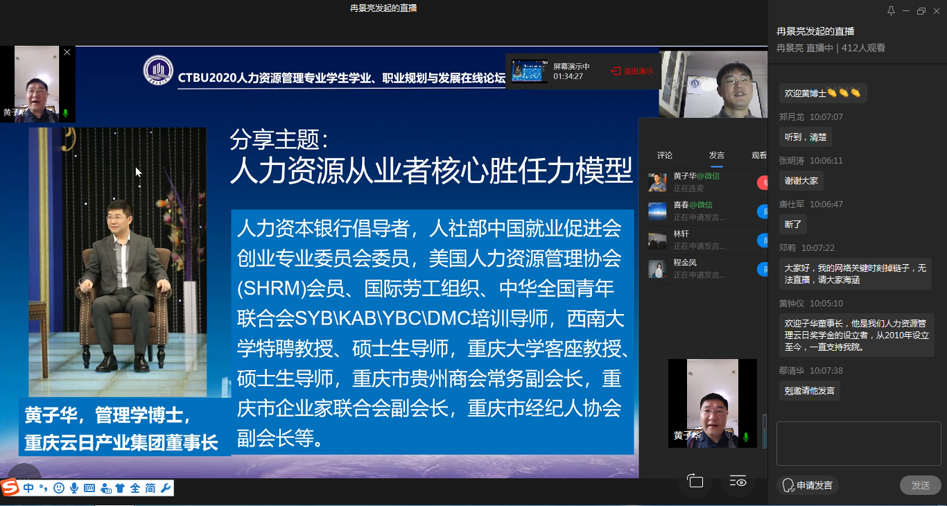 2020年3月14日上午,在我国新冠肺炎疫情防控趋势积极向好背景下,CTBU2020年人力资源管理专业学生学业、职业规划与发展在线论坛通过学校“企业微信”平台直播顺利召开。副校长李国军,管理学院党委书记王建明、院长杨柏、党委副书记王静、副院长周莉、副院长黄钟仪、人力资源管理系系主任郑月龙参加了此次在线论坛。重庆云日产业集团董事长黄子华为特邀嘉宾并作主题发言。校友嘉宾广州名度网络科技有限公司创始人、总经理张喜春,重庆房地产职业学院彭茜老师,重庆中雷律师事务所副主任王明涛律师及重庆中科建设(集团)有限公司人力资源部曹洋铭总监等参加了活动并发言分享。人力资源管理系全体老师、校友、同学、家长共计450余人次参与了论坛。论坛由人力资源管理系冉景亮博士主持。