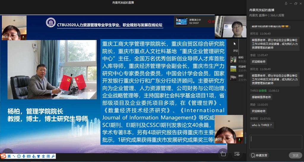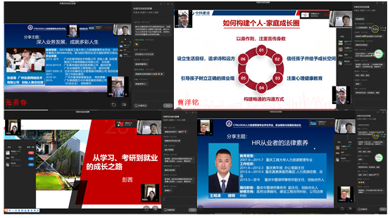 在嘉宾分享环节,特邀嘉宾黄子华为大家讲解了人力资源从业者核心胜任力模型,并提出优秀的HR从业者的素质包括快速学习能力,跨文化沟通能力以及能快速融入当地的社会网络的能力。简短的分享,直指关键,使同学们和在线参会人员获益颇多。校友嘉宾张春喜从业务方面告诉大家要“深入业务发展,成就多彩人生”,指出人力资源管理要深入业务、助力业务发展,同时结合自己的经历分享感悟,启迪学弟学妹们如何少走弯路、成就属于自己的精彩人生;校友嘉宾彭茜结合自身经历,分享了自己的学习、考研到就业的成长之路,勉励人资学子勤学奋进,不断拼搏;校友嘉宾王明涛从律师的专业角度为大家阐述了HR从业者的法律素养,并通过实际案例阐述HR从业者法律素养的重要性,具备基本的法律素养,助力HR从业者职业生涯稳健向前发展;校友嘉宾曹洋铭与大家分享了如何营造个人及组织环境、助推HR生态发展,曹总监结合自身职业发展经历,从企业视角下的优秀人才、优秀人力资源从业者特质、如何构建个人成长池及如何构建个人-家庭成长圈等方面进行了精彩分享。嘉宾的分享,不同的视角,同一个目的,为了帮助HR专业的同学们找准自己的路、成就属于自己的职业精彩。嘉宾分享过程中,同学们通过对话框积极与嘉宾、老师们互动,表达自己的深刻感悟。在互动问答环节里,人力资源管理系熊雪原博士等为同学们解答了考研相关问题,师生互动意犹未尽。人力资源管理系老师讨论决定,择日召开在线答疑语音会,专为同学们答疑解惑。