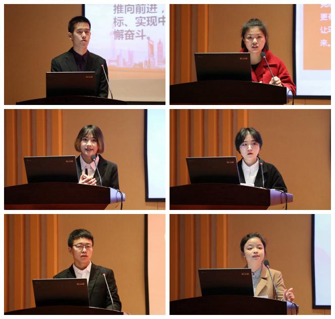 会上,胡家铭同学以“学习习近平总书记在庆祝改革开放四十周年大会上的重要讲话精神”为题,交流了新时代中国特色社会主义取得的伟大成就和宝贵经验。张若兰同学以“学习习近平在纪念马克思诞辰200周年大会上讲话的精神”为题,论述了学习马克思主义的重要意义。张传玲同学以“五四青年,吾是青年”为题,解读了习近平在纪念五四运动大会上对青少年提出的六点要求,表达了新时代中国青年的使命与担当。郑淑元同学以“青年要自觉践行社会主义核心价值观”为题,论述了社会主义核心价值的内涵,提出了青年践行社会主义核心价值观的时代要求。王忠岩同学以“辩证唯物主义是中国共产党人的世界观和方法论”为题,围绕习近平关于世界唯物主义的理论,交流了青年大学生自我提升的意义和方法。邝贝同学以“习近平关于脱贫攻坚重要讲话精神学习汇报”为题,以实际案例论述了中国共产党人“不忘初心、牢记使命”的使命与责任。