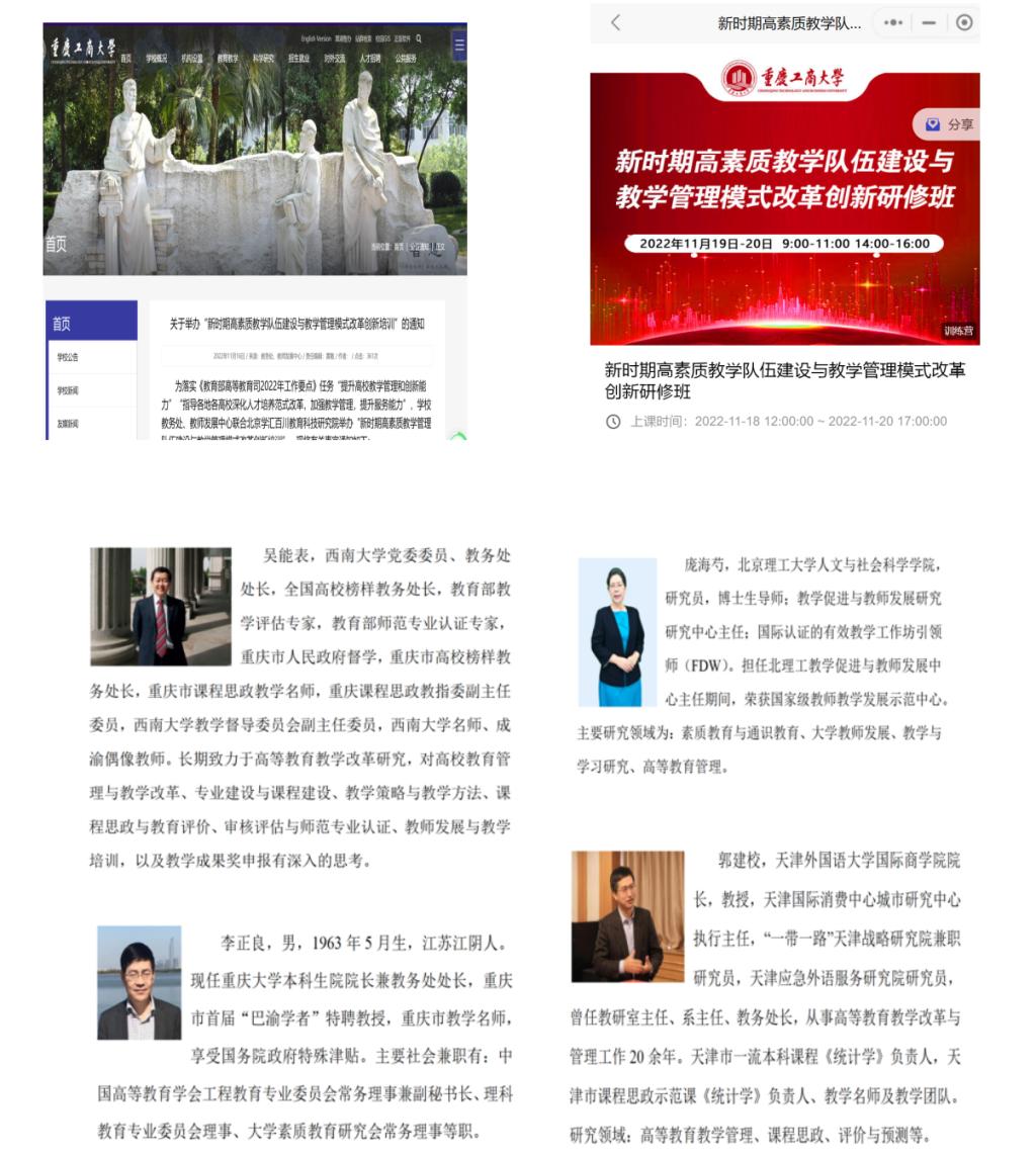 本次培训通过线上学习的方式,邀请到西南大学教务处长吴能表、北京理工大学人文与社会科学学院教授庞海芍、天津外国语大学国际商学院院长郭建校、重庆大学本科生院院长兼教务处长李正良分别围绕教学过程中的管理、教育理念、智慧管理、管理思路等开展主题报告。