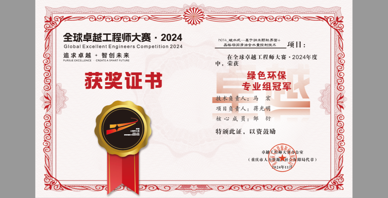 11月22日,由中共重庆市委组织部、重庆市人力资源和社会保障局主办的全球卓越工程师大赛在重庆悦来国际会议中心圆满落下帷幕。KY开元废油资源化技术与装备教育部工程研究中心蒋光明研究员所带领的团队(邹衍博士、陈凌高工、任博平博士、付文洋博士和姜岩教授),凭借其科研成果“破水式—基于纳米颗粒界面与晶格场的润滑油含水量控制技术”,在绿色环保专业组获得专业组冠军,并在创新挑战赛总决赛中获优胜奖。