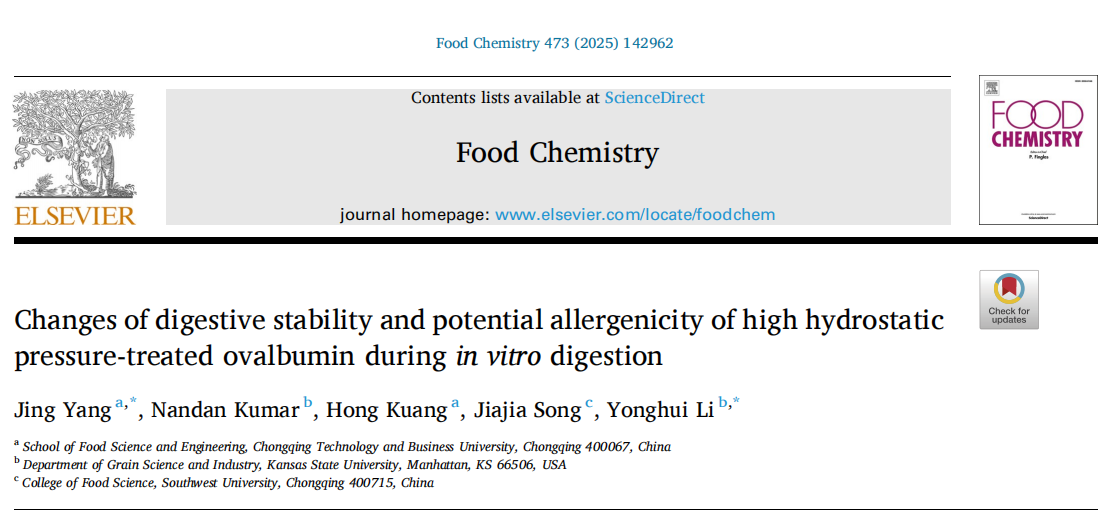 杨景副教授在《Food Chemistry》期刊上发表了三篇研究论文分别是“Changes of digestive stability and potential allergenicity of high hydrostatic pressure-treated ovalbumin during in vitro digestion”“Effects of high hydrostatic pressure processing on the physicochemical properties, functional characteristicsand antioxidant activity of silkworm pupae protein”和“Application of edible insects to food products: A review on the functionality, bioactivity and digestibility of insect proteins under high-pressure/ultrasound processing”。