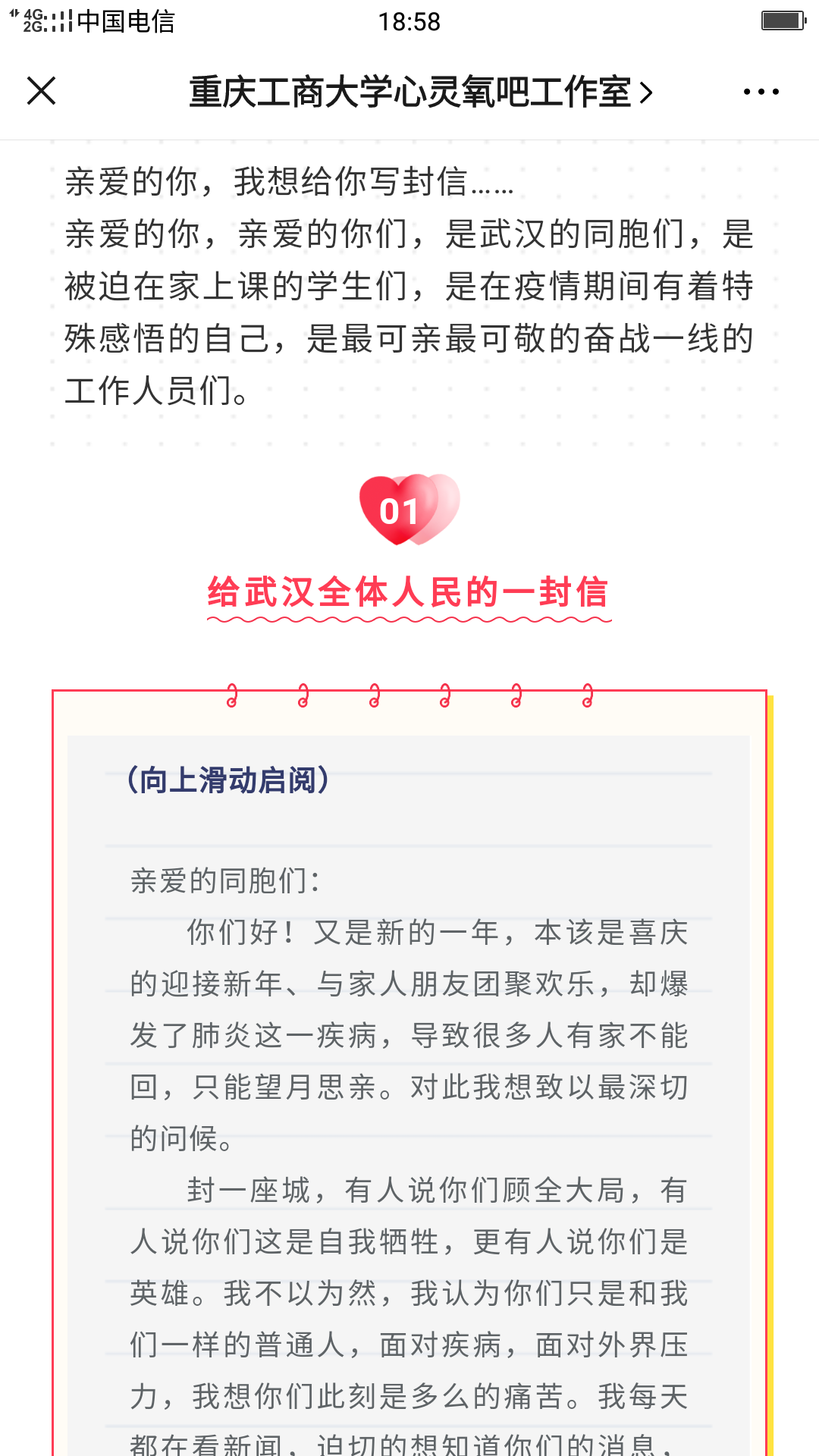 给“同窗”写信的外语学院郭奕好同学写道:“身居在家的日子,我们依然要坚定地选择“有序”和“有情”,有序的制定学习计划,在短暂的休息之后不要放弃自己的理想追求。”