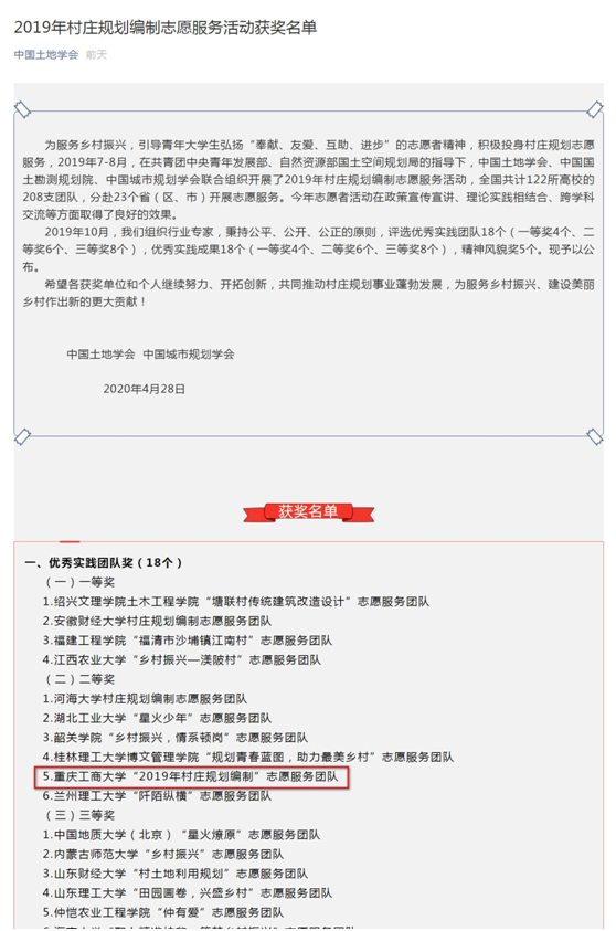 近日,中国土地学会公布了“2019年村庄规划志愿服务全国大学生暑期社会实践专项行动”的获奖名单,KY开元旅游与国土资源学院“2019年村庄规划编制”志愿服务团队荣获优秀实践团队二等奖。这是继2018年荣获全国优秀实践成果一等奖以来,旅游与国土资源学院实践团队第二次获得同类奖项,团队获奖作品由人文地理与城乡规划系专业教师郑凌予、蒲海霞,土地资源管理系专业教师鄂诗璇和辅导员胡菡共同指导。