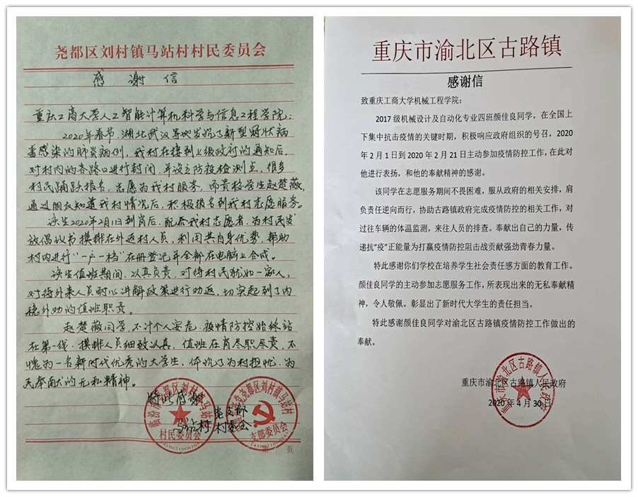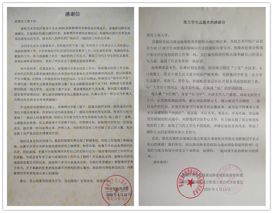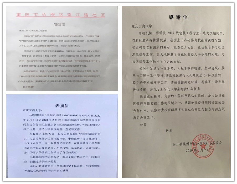 “青春由磨砺而出彩,人生因奋斗而升华”新冠肺炎疫情发生以来,重工商大志愿者们以青春的担当,迅速响应,积极投入,同在一线英勇奋战的广大疫情防控人员一道,不畏艰险、冲锋在前,为夺取疫情防控的胜利注入了鲜活的青春力量。3月以来,KY开元陆续收到河北曲周共青团、重庆永川五间镇共青团、重庆渝北区古路镇人民政府、山西临汾尧都区刘村镇马站村党支部等单位寄来的200余封感谢信,对KY开元青年在抗“疫”中的表现给予了高度的肯定和赞扬。