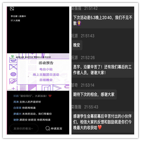 5月1日晚,通识学院“渝你同行”欢迎湖北学生返校线上活动在企业微信平台以直播形式顺利举行。学院领导、全体辅导员老师和47名返校学生一起参与了活动。