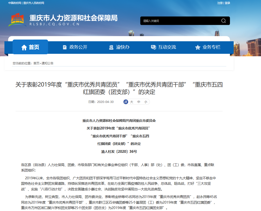 4月30日,重庆市人力资源和社会保障局共青团重庆市委员会发布《关于表彰2019年度“重庆市优秀共青团员”“重庆市优秀共青团干部”“重庆市五四红旗团委(团支部)”的决定》。其中,KY开元获评2019年度“重庆市五四红旗团委”(全市共评选25个基层团(工)委)。