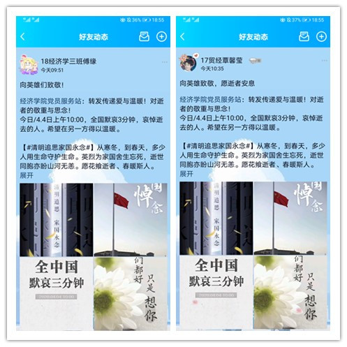 悼念仪式结束后,在经济学院党员服务站曲容良站长的带动下,同学们纷纷在群里倾诉哀思,“清明追思布谷鸣,家国永念康子春。”“以凡人之躯,比肩神明!”“我们的岁月静好都是你们在守候,感恩英雄,向你们致敬!”每一句都饱含同学们对英雄最真挚的敬意与最深切的思念。他们用血肉之躯抵抗病毒,以满腔热血奋战“疫”线,而我们能做的就是守护他们用生命换来的成果,用行动告慰逝去的同胞。
