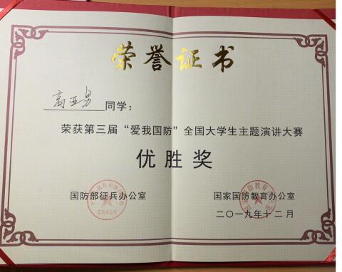 12月8日,由国防部征兵办公室和国家国防教育办公室主办的2019年“爱我国防”全国大学生主题演讲比赛总决赛在河北石家庄举行。本次比赛共有来自31个省市的40支高校代表队进入决赛,KY开元财政金融学院学生高亚男代表重庆市参加了比赛,经过一天的激烈角逐,高亚男以最终排名16名的成绩获得了全国总决赛优胜奖。
