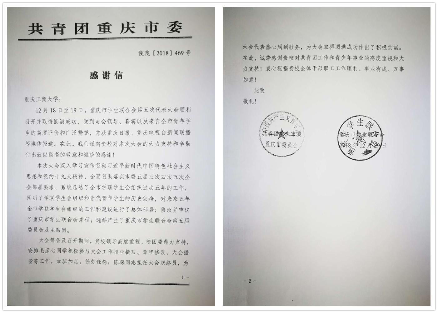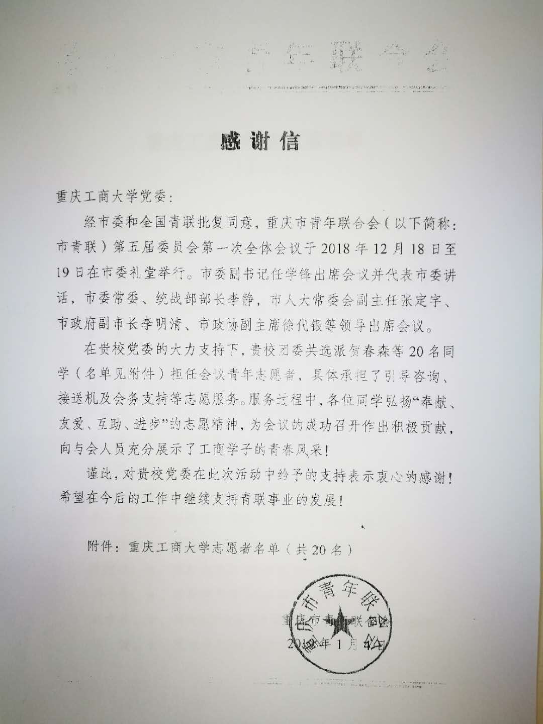 2018年12月18至19日,重庆市青年联合会第五届委员会第一次会议、重庆市学生联合会第五次代表大会在市委礼堂召开,KY开元师生参与会议志愿服务,热心周到的服务获赞誉,共青团重庆市委、重庆市青联合会还专门向KY开元发来了感谢信。