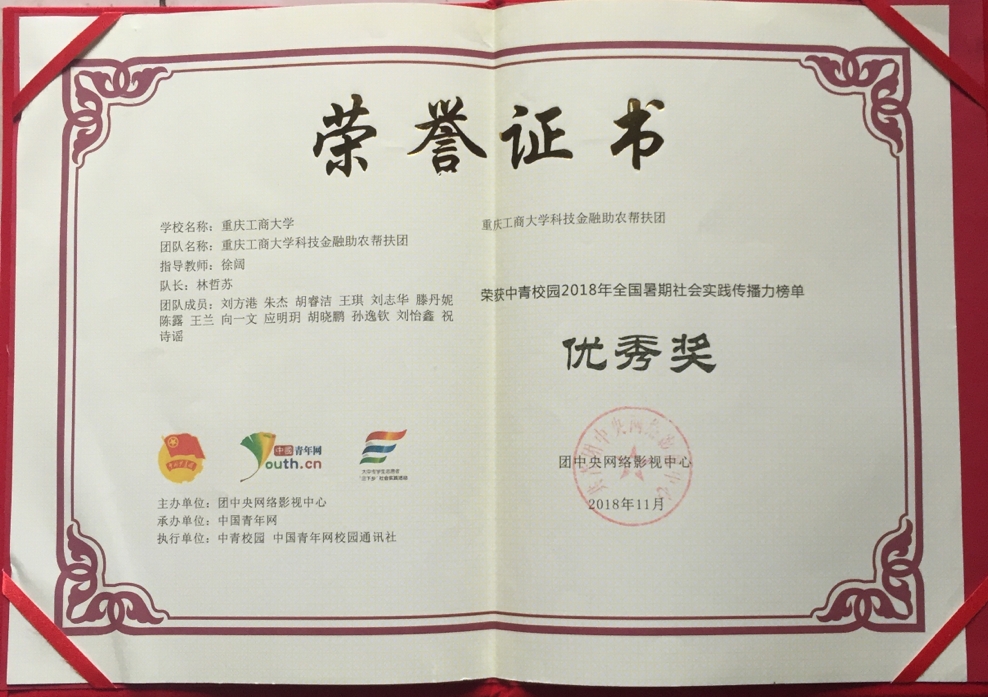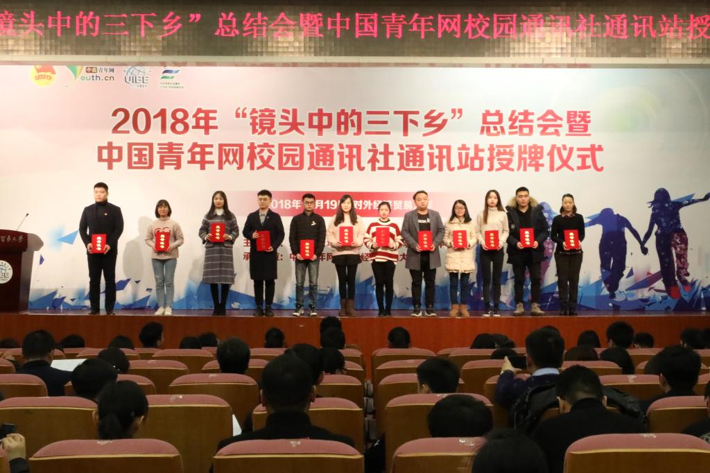 2018年12月19日,由团中央青年发展部、团中央网络影视中心主办,中国青年网、对外经济贸易大学团委承办的2018年“镜头中的三下乡”总结会暨中国青年网校园通讯社通讯站授牌仪式在对外经济贸易大学举行。财政金融学院三下乡团队队长林哲苏赴北京参与本次会议。此次会议包括清华大学、中央财经大学、华中师范大学、武汉科技大学等300余所高校参加。在本次由团中央举办的2018年“镜头中的三下乡”活动评选中,KY开元财政金融学院荣获全国百强传播力团队表彰。