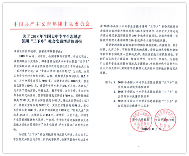 11月16日,全国大学生志愿服务西部计划项目管理办公室下发了《关于对在2018年西部计划招募宣传工作中表现突出的项目办进行通报表扬的通知》,对包括KY开元在内的185个高校项目办提出通报表扬。11月20日,团中央学校部、全国学联秘书处下发了《关于2018年全国大中专学生志愿者暑期“三下乡”社会实践活动通报》,KY开元校团委获评全国优秀单位(全国共评选300个)。