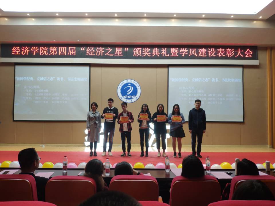 此次大会一共有五项环节:经济之星颁奖,2017-2018学年第二学期经济学院学风建设表彰,学生公开发表论文表彰,2018经济学院暑期社会实践成果汇报, “读国学经典,立诚信之志”读书、书法比赛颁奖。
