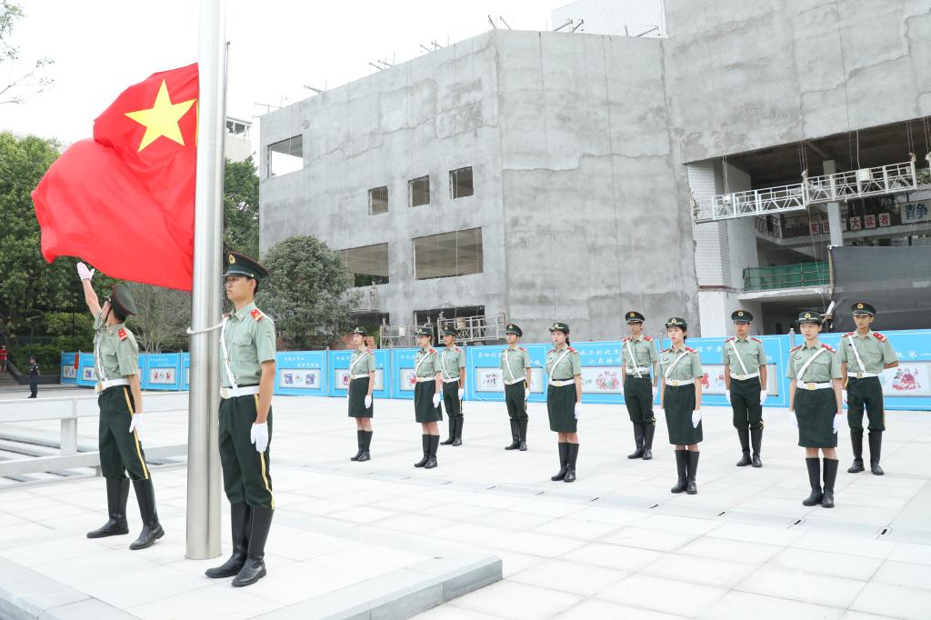 7点40分,国旗护卫队三名英姿飒爽的国旗手踏着矫健的步伐,护卫着国旗走到旗杆前。随着雄壮激昂的国歌声,鲜艳的五星红旗冉冉升起。现场的师生庄严地向国旗行注目礼。