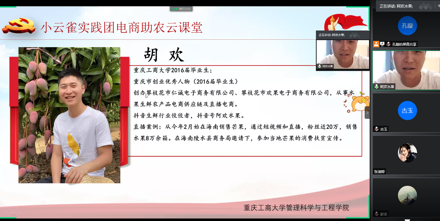 陈春洁首先致辞,感谢胡欢和史亚飞两位校友对学院和学校工作的大力支持。胡欢是重庆市创业优秀人物,抖音生鲜行业的佼佼者,创办了欢果电子商务有限公司,曾参与海南陵水县商务局的扶贫助农等活动。史亚飞曾是学院电商助农服务队的第一任队长,是冒泡影视文化传媒有限公司负责人,参加过重庆市“双晒”第二季大渡口区长直播带货等活动。